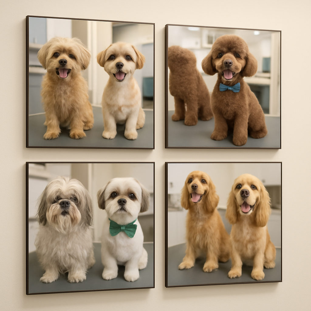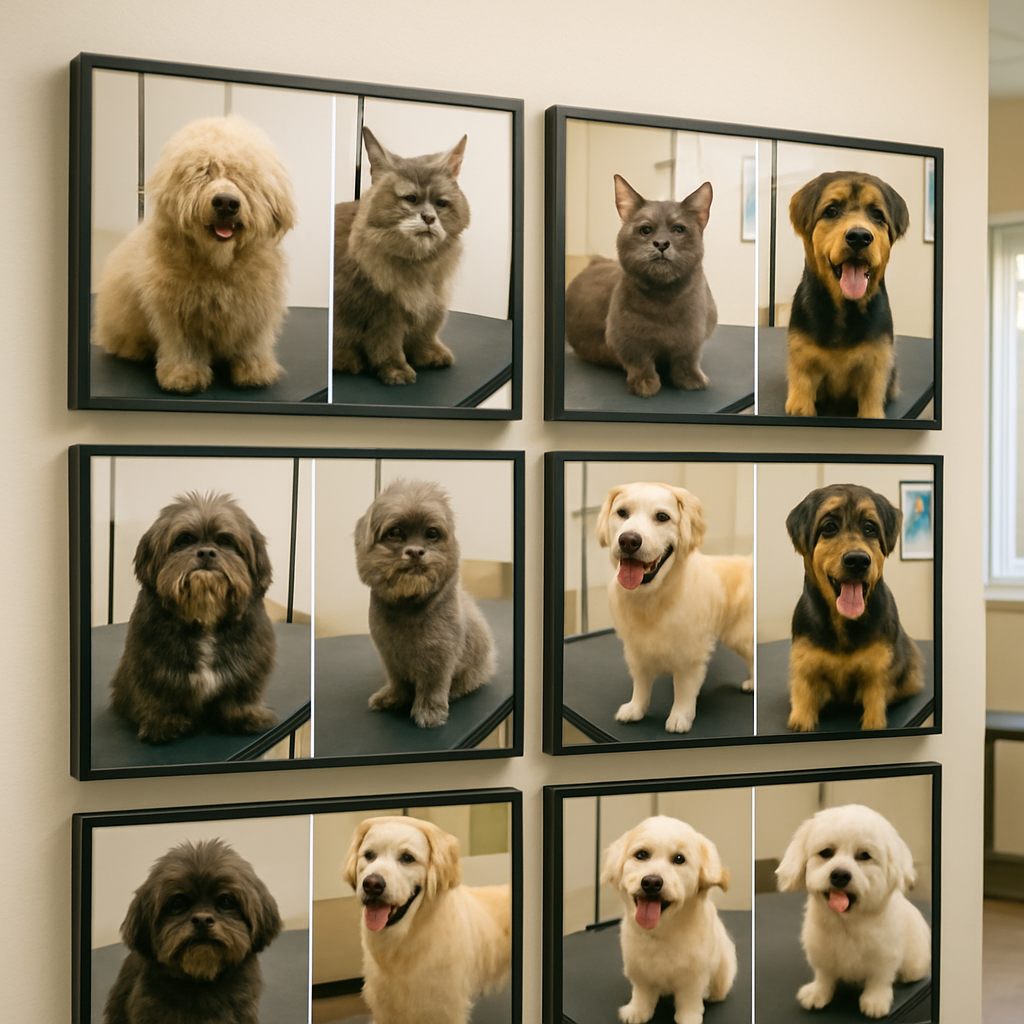 Before-and-after photo gallery showcasing our grooming results and happy pets.